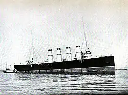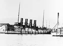 The ship's propulsion system consisted of three vertical triple-expansion steam engines driving three screw propellers. Steam was provided by fourteen coal-burning, Normand Sigaudy water-tube boilers. The boilers were divided into four boiler rooms, three groups of four and a fourth group of two. These were ducted into four funnels located amidships; the funnel number and arrangement was also selected to give her the appearance of a passenger liner. Her machinery was rated to produce 23,000 indicated horsepower (17,000 kW) for a top speed of 24 knots (44 km/h; 28 mph) Coal storage amounted to 1,960 long tons (1,990 t).[5][8] Her cruising range was 7,500 nautical miles (13,900 km; 8,600 mi) at a speed of 12 knots (22 km/h; 14 mph).[9] During her initial speed test, she only reached 23.12 knots (42.82 km/h; 26.61 mph) from 21,600 ihp (16,100 kW).[10]