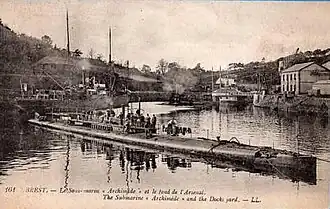Archimède was ordered on 31 December 1906 as part of the 1906 competition from the Cherbourg Naval Base (Arsenal de Cherbourg). She was laid down on 2 January 1908 and was launched on 4 August 1909.[2] While exiting the harbor on 24 December, the boat accidentally struck the Cassard a glancing blow while turning. Neither ship was damaged.[7] Engineering problems delayed Archimède's commissioning until September 1911[2] when she was assigned to the Cherbourg defensive group of submarines. Early the following year, the boat was transferred to the 1st Submarine Flotilla (1ère escadrille de sous-marins) of the Light Squadron (Escadre légère) when those units were formed. On 10 June 1912, the submarine was transferred to the Third Squadron at Brest for offensive missions.[7]