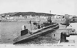 Cigogne had a surfaced displacement of 178 long tons (181 tonnes) and a submerged displacement of 253 long tons (257 t). Her dimensions were 35.9 metres (117 feet 9 inches) long, with a beam of 4.04 m (13 ft 3 in) and a draught of 2.63 m (8 ft 8 in). She had a single shaft powered by one diesel engine for surface running of 150 hp (112 kW) and an electric motor which produced 130 horsepower (97 kilowatts) for submerged propulsion. The maximum speed was 9.3 knots (17.2 kilometres per hour; 10.7 miles per hour) on the surface and 6.2 knots (11.5 km/h; 7.1 mph) while submerged with a surfaced range of 1,300 nautical miles (2,400 kilometres; 1,500 miles) at 8 knots (15 km/h) and a submerged range of 65 nautical miles (120 km) at 3.8 knots (7.0 km/h). Her complement was 14 men.[1][2][3]