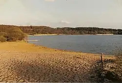 Frensham Great Pond, lying within Frensham Common, extends over 100 acres (0.40 km2) and is a centre for sailing activities.[12] The pond sometimes suffers from eutrophication. The occasional presence of blue-green algae means that official advice regarding swimming varies, as indicated by notices at the water's edge. The smaller Frensham Little Pond is a scenic area for picnics - neither swimming nor sailing is allowed there.