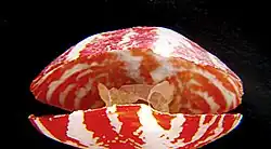 - Frenulina sanguinolenta has creamy white radiating stripes of quickly varying width on a scarlet shell, or is very rarely entirely white. It is very common in the western Pacific, including Australia, New Caledonia, French Polynesia, Philippines, China, Japan and Hawaii, but also occurs in the Indian Ocean.[2]