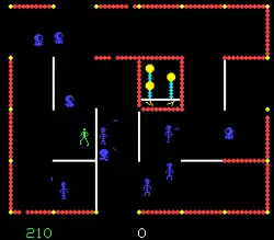 In Berzerk, the walls are all electrified and kill the player on contact. In Frenzy, some of the walls of the maze are composed of "dots" which can be shot. This opens up strategies such as blasting a hole in the side of a room and using it to escape when in trouble. The solid walls, on the other hand, now reflect shots. The player can trick robots into killing themselves by standing on the opposite side of a reflective wall and letting them shoot it. The only wall that simply absorbs shots harmlessly like in the original is the closed door that appears behind the player when they enter a new room.