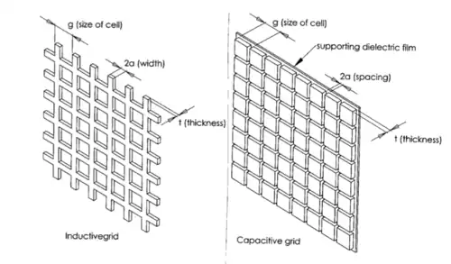 The two fundamental types of FSS are shown in Fig. 2.4.1-1 to the right - the bandpass mesh-type FSS and the bandstop patch-type FSS (Metal-mesh optical filters). The equivalent circuit for a patch-type bandstop FSS is shown in Fig. 2.4.1-2. The impedance of the series connection of the inductor and the capacitor is (Desoer, Kuh [1984]): or, and this series connection of an inductor and capacitor produces a zero impedance (short circuit) condition when