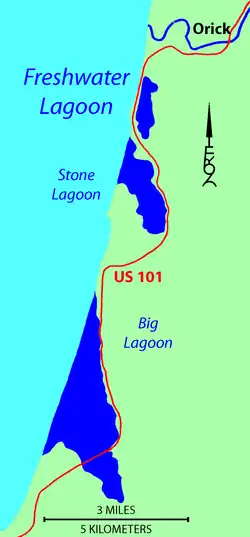 The lagoons are shallow bays between rocky headlands where coastal wave action has formed a sandy bar separating each lagoon from the Pacific Ocean. The lagoons are resting areas for migratory waterfowl using the Pacific Flyway between Lake Earl on the Smith River estuarine wetlands, which is 40 mi (64 km) to the north, and Humboldt Bay on the Mad River estuarine wetlands, which is 30 mi (48 km) to the south.