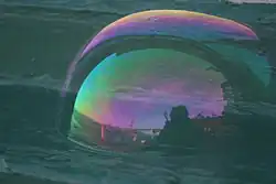 Although Newton rejected the wave theory, he noticed its potential to explain colors, including the colors of "thin plates" (e.g., "Newton's rings", and the colors of skylight reflected in soap bubbles), on the assumption that light consists of periodic waves, with the lowest frequencies (longest wavelengths) at the red end of the spectrum, and the highest frequencies (shortest wavelengths) at the violet end. In 1672 he published a heavy hint to that effect,[10][11]: 5088–5089 but contemporary supporters of the wave theory failed to act on it: Robert Hooke treated light as a periodic sequence of pulses but did not use frequency as the criterion of color,[12] while Huygens treated the waves as individual pulses without any periodicity;[13] and Pardies died young in 1673. Newton himself tried to explain colors of thin plates using the corpuscular theory, by supposing that his corpuscles had the wavelike property of alternating between "fits of easy transmission" and "fits of easy reflection",[14][15] the distance between like "fits" depending on the color and the medium [16] and, awkwardly, on the angle of refraction or reflection into that medium.[17][18]: 1144 More awkwardly still, this theory required thin plates to reflect only at the back surface, although thick plates manifestly reflected also at the front surface.[19] It was not until 1801 that Thomas Young, in the Bakerian Lecture for that year, cited Newton's hint,[20]: 18–19 and accounted for the colors of a thin plate as the combined effect of the front and back reflections, which reinforce or cancel each other according to the wavelength and the thickness.[20]: 37–39 Young similarly explained the colors of "striated surfaces" (e.g., gratings) as the wavelength-dependent reinforcement or cancellation of reflections from adjacent lines.[20]: 35–37 He described this reinforcement or cancellation as interference.