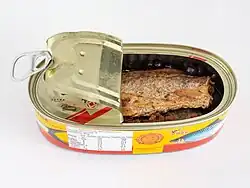 Fried dace with salted black beans is a canned food of Chinese origin. Cirrhinus molitorella (dace) is a fish from the Pearl River in China.[1] ‘Dace’ is a trade name of Cirrhinus molitorella while ‘salted black beans’ refers to fermented black soybeans known as “dau si” (豆豉)[2] in Cantonese. Fried dace with salted black beans is made by combining dace with salted black beans[3] and preserving it in oil afterwards.