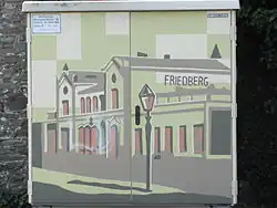 The first Friedberg station was opened on 10 May 1850 with the opening of the section of the Main-Weser Railway from Frankfurt am Main to Friedberg. On 9 November 1850 the next section to Butzbach was opened. The entire route of the Main-Weser line from Kassel to Frankfurt was opened for traffic 15 May 1852.[5] The station was at the 165.4 kilometre mark (from Kassel) and was designed as a through station. There is currently a parking garage on the site of the old station building.