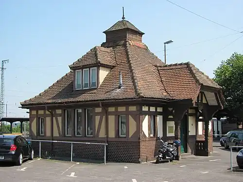 The current station building and other buildings of the station are mostly classed as cultural monuments under the Hessian Heritage Act. The current station building was built in 1912–1913 in a mixture of neoclassical and Renaissance Revival architecture to the design of a government architect from Darmstadt, Krause, who was influenced by Armin Wegner.[6] In the vestibule are original ceramic tiles and stained glass windows, which are influenced by Art Nouveau.