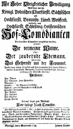 In 1736, Neuber came to Frankfurt with the intention to perform respectable theatre and set up her stage on the Liebfrauenberg.[5] The Neubers pattern in 1736-7 was to play "major dramas of classical base of German imitations" while excluding the traditionally crude topics associated with the popular theatrical character Harlekin from their performances.[5] This demonstrated that a change in tone for theatre in Frankfurt was beginning, with the Neubers performances that were more respectable than the popular theatre revolving around Harlekin.[5] However, it took more than Neuber's resolve to "change the taste and demands of most audiences of the day."[5]