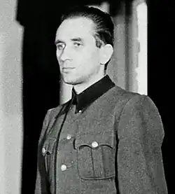 Friedrich Entress was born on 8 December 1914 in Posen, a Polish-Prussian province,[1] and graduated in medicine in either 1938[2] or 1939.[1] He was able to receive his doctorate in 1942 without writing a dissertation, "a privilege granted to Germans from the east".[3] He had grey eyes and dark blonde hair and was described as having a "Nordic" profile. According to Michael Kater, he was part of a vigilante group of ethnic Germans that was supported by the Schutzstaffel (SS), and after the German invasion of Poland he joined the SS-Totenkopfverbände.[1]