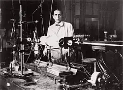 Houtermans was a Communist;[15] he had been a member of the German Communist Party since the 1920s.[16] After the election of Adolf Hitler in 1933, Charlotte Houtermans insisted that they leave Germany. They went to Great Britain, near Cambridge, where he worked for the EMI (Electrical and Musical Instruments, Ltd.) Television Laboratory.[17] In 1935 Houtermans emigrated to the Soviet Union, as the result of a proposal by Alexander Weissberg, who had emigrated to there in 1931.[18] Houtermans took an appointment at the Kharkov Physico-Technical Institute and worked there for two years with the Russian physicist Valentin P. Fomin. In the Great Purge, Houtermans was arrested by the NKVD in December 1937. He was tortured and confessed to being a Trotskyist plotter and German spy, out of fear from threats against Charlotte. However, Charlotte had already escaped from the Soviet Union to Denmark, after which she went to England and finally the USA.[19] After the Hitler-Stalin Pact of 1939, Houtermans was turned over to the Gestapo in May 1940 and imprisoned in Berlin. Through efforts of Max von Laue, Houtermans was released in August 1940, whereupon he became employed Forschungslaboratorium für Elektronenphysik,[20] a private laboratory of Manfred Baron von Ardenne, in Lichterfelde, a suburb of Berlin. In 1944, Houtermans took a position as a nuclear physicist at the Physikalisch-Technische Reichsanstalt.[3] [4][17][21]