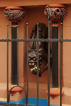 The Monkey Fountain is a fountain on the outside wall of a bank in the historic center of Freiburg which was built in 1905 to replace an older cast iron fountain in the same place. The bank built the fountain with the financial support of the city as a public water supply fountain. Friedrich Meinecke's sculpture depicts a monkey biting an apple. Water flows from the mouth of the monkey into a semicircular bowl and from there into one of Freiburg's streamlets. Symbolically, the monkey represents a man who must bite the sour apple (as they say in German for being forced to do something unpleasant, i.e. having to bite the bullet) and pay the debts of another after carelessly having given bail.[2]