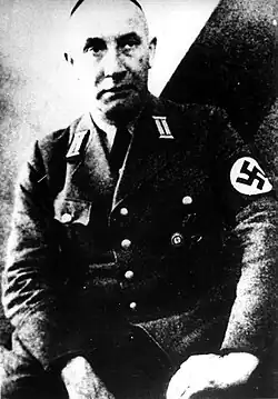 Uebelhoer held the rank of SS-Brigadeführer in the Schutzstaffel and received commendation for his involvement in the annexation of the Sudetenland and for his part in the Anschluss.[4] Following the conquest and occupation of Poland, he served as an inspector in the Reichsgau Wartheland. He ordered the construction of the Jewish ghetto in Łódź on 10 December 1939, a measure he described as only temporary, adding that ultimately the Nazis intended to "burn out this plague dump".[5] In March 1940, he was made the Regierungspräsident (district president) of Kalisz-Łódź .[6]