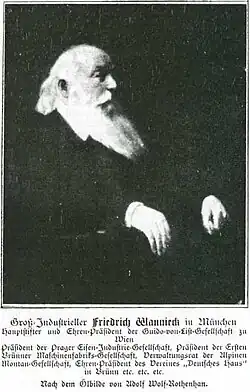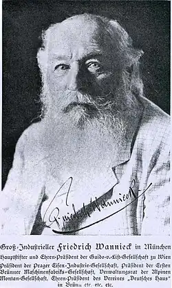 Wannieck founded Friedrich Wannieck & Co. in 1864.[3] He was also chairman of the Prague Iron Company and the First Brno Engineering Company, both major producers of capital goods in the Habsburg empire. He was also president of the organisation and publishing house Verein "Deutsches Haus" ("German House" Association) in Brno. This was a nationalist association for German inhabitants of the city, who knew it by the name of Brünn and felt encircled by the overwhelming Czech population of South Moravia (Goodrick-Clarke 1985: 37).
