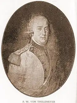 Thulemeyer was the son of Wilhelm Heinrich von Thulemeyer, a royal Prussian Minister of State and War and a member of the Tabakskollegium. His family can be traced back to around 1560, located in the Principality of Lippe.[3] His mother, Ernestine von Schilden, came from Hanover. When his father suddenly died his mother was only 34. The young Thulemeyer was educated at public expense, most probably on the royal Joachimsthalsches Gymnasium, while he was the godson of Friedrich Wilhelm I of Prussia. Thulemeyer studied law in Frankfurt and was trained by a Mr. Passavant. According to Von Putkamer he moved to Paris after finishing his studies. In 1763 he obtained a post in The Hague. On behalf of Frederick the Great, he was involved to arrange a marriage between the prince William V of Orange and the sixteen-year-old Wilhelmine of Prussia.