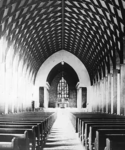 The housing shortage in Germany in the 1920s led to the need to build housing as quickly and cheaply as possible. Existing building techniques were improved, procedures rationalised and new ideas developed. In Merseburg, City Planning Councillor Friedrich Zollinger was involved with developing industrial mass production methods for standardised building systems. Using barrel vaults that are constructed by connecting parallel rafters with staggered boards as a reference, Zollinger developed the principle of a diamond lamella roof without planks and rafters. On 14 October 1921, he applied for a patent for his roof construction made of short planks, which was granted on 28 December 1923. The patent describes space-enclosing, flat or curved constructions.[3] From 1921 until 1926, the construction system was marketed and distributed by the Deutsche Zollbau-Licenz-Gesellschaft m.b.H., which afterwards was replaced by the Europäische Zollbau-Syndikat A.G.. In 1926, the European Customs Construction Syndicate AG advertised on a leaflet with 850,000 square metres already built.[4]