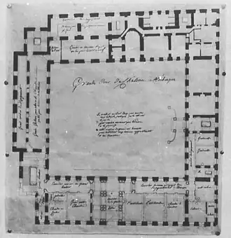 Very little is known about the exact dimensions and interior of the castle.[5] There is a blueprint remaining of one of the castle's floors (ground?), drawn by the architect Pierre Michel d'Ixnard.[5] It is estimated that the castle area was approximately 100 times 150 metres, and that the sides of the main building were 75 metres long.[4]