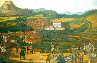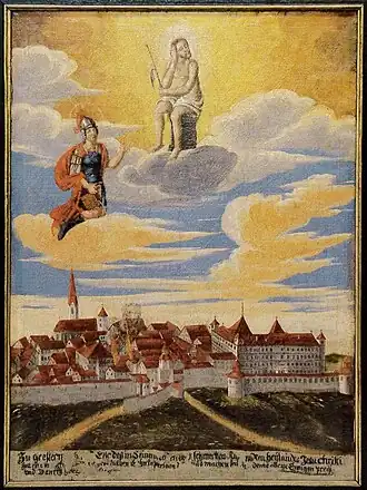 Between 11 and 15 October 1598, the castle was the setting for an opulent wedding that Eitel Frederick IV organized for his son Johann Georg, Prince of Hohenzollern-Hechingen (1577-1623) and Franziska von Salm-Neufville.[2] Around 1,000 guests came to Hechingen for a week-long celebration, including 200 nobles.[2] The margrave of Baden alone travelled with 300 horses. The wedding festivities included the wedding in the palace chapel and a wedding banquet, but also dance events, hunts, gift presentations.[2] The wedding has been immortalized in a poem by the poet Jakob Frischlin (1557-1621).[3]