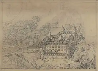 Schloss Friedrichsburg was a quadrangular castle in renaissance style, similar to Schloss Heiligenberg and Schloss Zeil, near Leutkirch im Allgäu .[1] It was located in the north western corner of the Hechingen city center.[4]