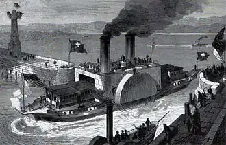 The first steam train ferry was put into operation in 1869 in Friedrichshafen jointly by the Royal Württemberg State Railway and the Swiss Northeastern Railway.[3] The engineer was an Englishman, John Scott Russell, who had already built the Stadt Schaffhausen in 1851 for Switzerland and was also involved in the construction of the Great Eastern (which at the time of its launch in 1858 was by far the world's biggest ship).[4] Like many of the working ships built at that time by Escher-Wyss of Zürich in Romanshorn, it had no name. Because of the enormous coal consumption of more than 50 kg of coal per km, it was soon popularly called the Kohlefresser (coal eater). The uneconomic ferry was taken out of service after boiler damage in 1883 and scrapped in 1885.