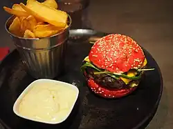 Their buns are baked and meats are ground in the restaurants. The mayonnaises and french fries are made by the staff as well.[1] The french fries are made with a so-called triple-cook method meaning that they are fried three times in different temperatures. The Finnish restaurant's domesticity rate is about 98%. The meals are almost fully additive-free.[2]