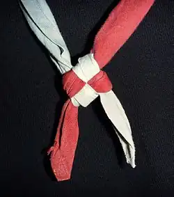 This is one of the eleven basic knots of traditional Chinese knotting,[1] a craft which began in the Tang and Song dynasty (960–1279 AD) in China. The Chinese and Japanese names for this knot are based on the shape of the ideogram for the number ten, which is in the shape of a cross that appears on one face (and a square on the other face).[2] The Ashley Book of Knots, first published in 1944, says: "A decorative Chinese Loop. This is commonly employed as a Lanyard Knot. It is handsome and secure."[3] In recent years, it has become popular with members of the Scout and Guide movements for tying their neckerchieves instead of using a woggle.[4]
