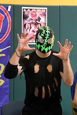After managing to pin Crossbones in an eight-man tag team match on March 20, Mike Quackenbush suggested that Frightmare should start going after the Young Lions Cup.[23] Frightmare received his shot at the Cup on June 26, but was defeated when the champion, BDK member Tim Donst, choked him out with a necktie.[24] On August 27, Frightmare entered the eighth annual Young Lions Cup tournament, defeating Brendan Michael Thomas, who had eliminated him from the tournament the previous year, in his first round match.[25] Later that same night, he defeated Christian Abel, Kaio, Amasis, Johnny Gargano and Akira Tozawa in a six-way elimination match to advance to the finals of the tournament.[25] On August 29 Frightmare defeated BDK member Lince Dorado to win the eighth Young Lions Cup tournament and score Chikara's first major victory in its war against BDK.[26] Frightmare made his first successful defense of the Young Lions Cup on September 19, defeating BDK's Pinkie Sanchez.[27] On October 23 Frightmare successfully defended the Young Lions Cup against Johnny Gargano, who cashed in his "Golden Opportunity" to get a title match.[28] The following week Frightmare made his first tour of Japan with Osaka Pro Wrestling.[29][30][31] On December 12, 2010, at the season nine finale, Reality is Relative, Incoherence aligned themselves with Hallowicked's long–time rival UltraMantis Black by saving him from Sinn Bodhi and The Batiri.[32] On March 13, 2011, Frightmare broke Max Boyer's record from 2006 for most successful defenses of the Young Lions Cup, when he defeated Batiri member Obariyon to make his sixth successful defense.[33] On April 15, Frightmare, Hallowicked and UltraMantis Black, now known collectively as the Spectral Envoy, were eliminated from the 2011 King of Trios in the first round by Team Dragon Gate (Akira Tozawa, Kagetora and Super Shisa).[34][35] On June 26, Frightmare defeated Batiri member Kodama to make his seventh and final Young Lions Cup defense.[33] On August 27, he was stripped of the title in time for the ninth annual Young Lions Cup tournament.[33] The Spectral Envoy and the Dark Army (Sinn Bodhi, Kobald, Kodama and Obariyon) faced each other in an eight-man tag team match on September 18, when the former was joined by UltraMantis Black's former Order of the Neo-Solar Temple partner Crossbones. The Spectral Envoy managed to win the match, after Ultramantis pinned Bodhi.[36] Afterwards, Frightmare was sidelined for the next eight months with an injury, before returning on May 20, 2012, during Chikara's tenth anniversary weekend.[34] On September 14, Frightmare, Hallowicked and UltraMantis Black entered the 2012 King of Trios, defeating Mihara, The Mysterious and Handsome Stranger and Tito Santana in their first round match.[34][37] The following day, the Spectral Envoy advanced to the semifinals of the tournament, after defeating their rival team The Batiri.[34] However, following the match, the Spectral Envoy was attacked by members of The Batiri and Ophidian.[38] On the third and final day of the tournament, the Spectral Envoy first defeated F.I.S.T. (Chuck Taylor, Icarus and Johnny Gargano) in the semifinals and then Team ROH (Mike Bennett, Matt Jackson and Nick Jackson) in the finals, despite interference from The Batiri, Delirious and Ophidian, to win the 2012 King of Trios.[34][39][40][41] On December 2 at Chikara's third internet pay-per-view, Under the Hood, the Spectral Envoy, represented by Frightmare, Hallowicked, UltraMantis Black and the returning Blind Rage and Crossbones, defeated The Batiri, Delirious and Ophidian in a ten-man tag team match.[34][42]