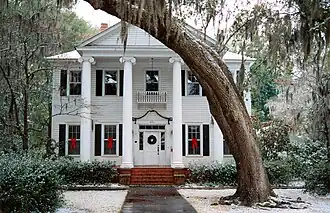 The front porch, with its four Ionic columns is typical of southern plantation homes. The house has approximately 5,000 square feet (460 m2) of living space in two stories and a finished attic that serves as a third floor. Its grandiose façade, subtly concealed by century-old oak trees naturally decorated with hanging Spanish moss, provides it with the distinction of being the most photographed house in town. Photographs of the Fripp-Fishburne house have appeared in numerous tourist brochures, newspapers, books, magazines, and travel guides.[4][5][6][7][8]