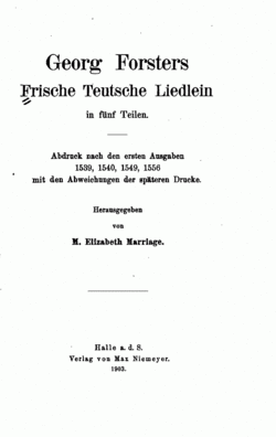 - M. Elizabeth Marriage (ed.): Georg Forsters Frische Teutsche Liedlein in fünf Teilen. Niemeyer, Halle 1903 (Frische teutsche Liedlein is available for free viewing and download at the Internet Archive).