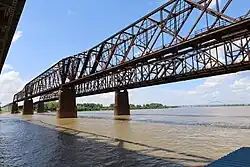 The Frisco Bridge, previously known as the Memphis Bridge, is a cantilevered through truss bridge[2] carrying a rail line across the Mississippi River between West Memphis, Arkansas, and Memphis, Tennessee.