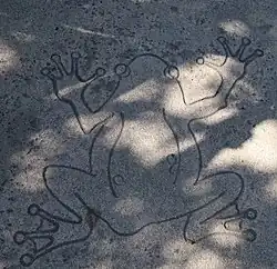 The community group that championed the creation of the larger park initially called themselves Friends of the Rockridge/Temescal Park and also FOG as an acronym for Friends of the Greenbelt.[3][1] With the design they were envisioning in the 2000s including the revival of the Temescal creek, and inspired by the amphibious ecosystem it represented, someone proposed that their acronym be modified to FROG, and that the name of the association be adapted to fit it: Friends of the Rockridge/Temescal Greenbelt.[8][3][1] The name Frog Park was popularly adopted and a few years later the City of Oakland also officially recognized it.[2][5]
