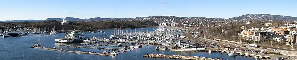 Frognerkilen was also a popular site of boat sports. The rowing club Christiania RK had its headquarters at the mainland, in a locality known as "Kongen" ('The King'),[6] whereas the Royal Norwegian Yacht Club had its headquarters at the opposite shore of Frognerkilen, in a locality known as "Dronningen" ('The Queen').[7] Frognerkilen was formerly trafficked by ferry; one ferry sailed between the railway station at Skarpsno and Oscarshall at Bygdøy, and the other sailed between Skillebekk and Kongen. Also, Frognerkilen was probably the site where Fiskerlivets farer, depicting perils at sea, was filmed. Released in 1908, it is considered to be the Norwegian drama film.[4]