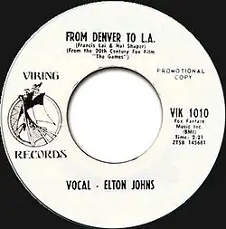 "From Denver to L.A." is a song written by Francis Lai and Hal Shaper, and performed by English musician Elton John. It was released on the soundtrack of the 1970 movie The Games.[1] The song was released as a single in the U.S. in July 1970, miscredited on the record label to "Elton Johns".[2]