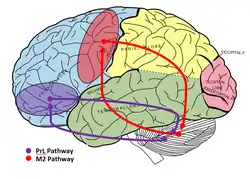 Two distinct fronto-cerebellar pathways have been identified through evoking and measuring field potentials on the cerebellar surface of rats. The first path originates from the PrL (prelimbic) sub-region of the mPFC (medial prefrontal cortex), and the second originates from the M2 region (premotor cortex). The path from the PrL cortex was found to be 5 milliseconds slower than the path from the M2 cortex. This difference in speed was part of the evidence supporting the idea of two pathways from independent origins. In addition, larger amplitude responses were recorded during PrL stimulation, further supporting that the pathways were separate.[6]