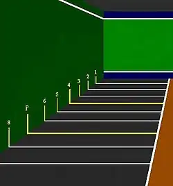 The lower zone line is 15 cm wide and the height depends on the size of the fronton (see chart). The upper zone is frequently marked at 10 m high on the wall and the line is also 15 cm wide.