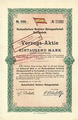 - ^ Joachim, Hahn. "Hochseefischerei Nordstern AG - Frosta die zweite DM-Emission". Hahn Historische Wertpapiere, alte Aktien und Sammleraktien, gedruckte Schmuckaktien, Aktienbilder, Anleihen, Obligationen, Schuldverschreibungen (in German). Retrieved 2018-08-27.