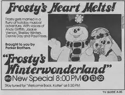 Frosty's Winter Wonderland is a 1976 animated Christmas television special and a standalone sequel to the 1969 special Frosty the Snowman, produced by Rankin/Bass Productions[1] and animated by Topcraft. It is the second television special featuring the character Frosty the Snowman. It returns writer Romeo Muller, character designer Paul Coker, Jr., music composer Maury Laws and actor Jackie Vernon as the voice of Frosty, while Andy Griffith stars as the narrator (replacing Jimmy Durante, who had been incapacitated by a stroke three years prior and retired from acting)[2] with the rest of the cast consisting of Shelley Winters, Dennis Day and Paul Frees. The special premiered on ABC on December 2, 1976.[3]