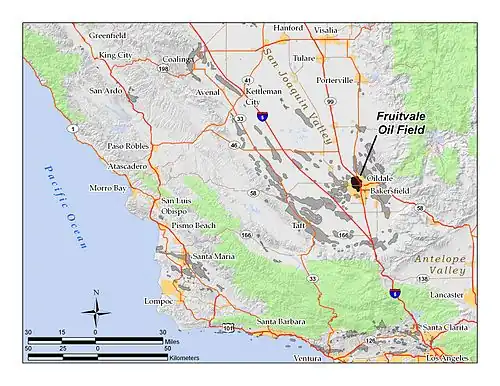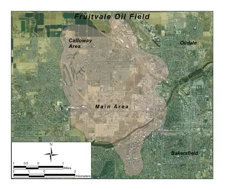 The Fruitvale Oil Field is a large oil and gas field in the southern San Joaquin Valley, California, within and just northwest of the city of Bakersfield, along and north of the Kern River. It is one of the few oil fields in the California Central Valley which is mostly surrounded by a heavily populated area. Discovered in 1928, and with a cumulative total recovery of more than 124 million barrels (19,700,000 m3) of oil at the end of 2006, it is 41st in size among California oil fields, and according to the California Department of Oil, Gas, and Geothermal Resources (DOGGR) its total reserve amounts to a little less than ten percent of its original oil.[1]