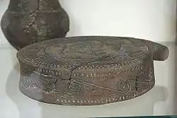 Frying pans first appear in the early Cycladic Kampos group. They already include various characteristics. As a rule, there is a central motif surrounded by a group of incised concentric circles, bands of stamped triangles, and spirals linked with double lines. Star patterns are also common. The decoration does not take up the whole surface. Often the decorative elements of the back surface are repeated on the sides. The Π-shaped stirrup handle is set into the wall of the pan with thick arms.[3]
