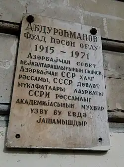 Fuad Hasan oghlu Abdurahmanov (Azerbaijani: Fuad Həsən oğlu Əbdürəhmanov; May 11, 1915 in Nukha (Sheki), Azerbaijan, Russian Empire – June 15, 1971 in Baku, Azerbaijan SSR, Soviet Union) was a popular Azerbaijani monument sculptor. He received many awards, including: Honored Worker of Arts of the Azerbaijan SSR (1943), People's Artist of the Azerbaijan SSR (1955), the first Azerbaijani to become a corresponding member of the Academy of Arts of the USSR (1949), and Laureate of the State Stalin Prize two times (1947, 1951).[1]