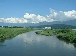 The Fuefuki River has its source the neighboring mountains of Mount Kobushi on the southern slope of Mount Kobushi in the north of Yamanashi, on Honshu, in Japan.[1][2] Its course takes a southeast direction to the Hirose dam then south, in the east of Yamanashi. Leaving Yamanashi, it successively crosses the northwest of Fuefuki to which it gives its name,[3] south of Kōfu, central Chūō and the northwest of the town of Ichikawamisato. Near the boundary between Ichikawamisato and Fujikawa, the Fuefuki and Kamanashi rivers[1] converge and form the Fuji River.[4][5]