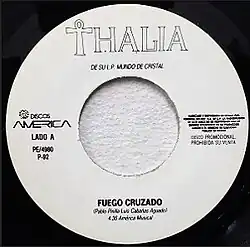 "Fuego Cruzado" is a song by the singer Thalía released as the third single from the album Mundo de Cristal, in 1992. The song was released after the controversy caused by the lyrics of the singer's previous single and was successful in the singer's home country.[1]