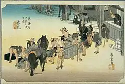 The classic ukiyo-e print by Andō Hiroshige (Hōeidō edition) from 1831–1834 depicts the actual business of the shukuba as a relay station to change horses and coolies to permit the rapid transmission of high priority messages and goods between Edo and Kyoto.
