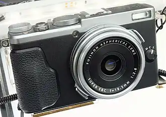 The Fujifilm X70 is an APS-C sensor digital compact camera with an 18.5 mm fixed prime lens (28 mm equivalent angle of view (AOV) in 35 mm full frame format).[1][2][3][4] It is part of Fujifilm's X-Series of cameras. It was announced in January 2016[5] (along with the Fujifilm X-Pro2) and was released on 18 February 2016.