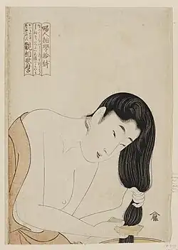 In Kamisuki (髪すき, "Combing the hair"), a woman washes and combs her hair over a washbasin. Her nude upper body is exposed. The inscription reads:[18]