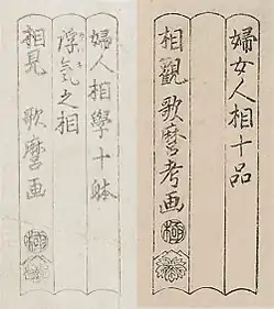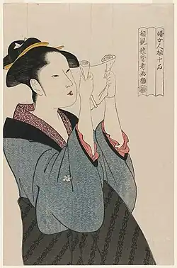 It is assumed the words 相見 and 相観 are read sōmi and that they refer to a person who reads physionomies, thus the signature can translate as.[8] This has to do with Sōgaku, a pseudoscience by which it was believed an analysis of facial features ("physignomy") could reveal personality traits. Texts were published at the time on these analyses. Utamaro's analyses were not based on these observations, but rather on allusions to other books, such as the illustrated story by Santō Kyōden of a prostitute disguised as a dancer, and an erotic book illustrated by Utamaro and Katsukawa Shunchō called Ehon Hime Hajime (会本妃女始, "Picture Book: First-Time Princesses", 1790), in which facial types are compared to the aspects of the sexual organs. Viewers likely were aware of the allusions of the prints to these books.[9]