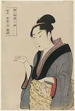 Kitagawa Utamaro (c. 1753–1806) made his name in the 1790s with his bijin ōkubi-e ("large-headed pictures of beautiful women") portraits, focusing on the head and upper torso, a style others had previously employed in portraits of kabuki actors.[4] Utamaro experimented with line, colour, and printing techniques to bring out subtle differences in the features, expressions, and backdrops of subjects from a wide variety of class and background. Utamaro's individuated beauties were in sharp contrast to the stereotyped, idealized images that had been the norm.[5]