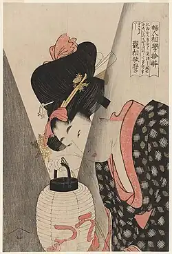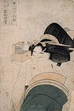 Ukiyo-e art flourished in Japan during the Edo period from the 17th to 19th centuries, and took as its primary subjects courtesans, kabuki actors, and others associated with the "floating world" lifestyle of the pleasure districts. Alongside paintings, mass-produced woodblock prints were a major form of the genre.[1] In the mid-18th century full-colour nishiki-e prints became common, printed using a large number of woodblocks, one for each colour.[2] A prominent genre was bijin-ga ("pictures of beauties"), which depicted most often courtesans and geisha at leisure, and promoted the entertainments of the pleasure districts.[3]