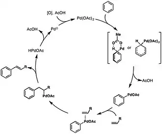 - ^ Fujiwara, Yuzo; Moritani, Ichiro; Matsuda, Masaoki; Teranishi, Shiichiro (1968). "Aromatic substitution of styrene-palladium chloride complex. II effect of metal acetate". Tetrahedron Letters. 9 (5): 633–636. doi:10.1016/s0040-4039(01)98820-3.