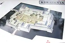 Shibata Katsuie was in constant conflict with neighbouring Uesugi Kenshin, and after Kenshin's death he was able to expand his territory into Kaga and Etchū Provinces. When Nobunaga was assassinated at the Honnō-ji Incident in 1582, Shibata was unable to move from Kitanoshō due to local instability, and was thus unable to prevent Toyotomi Hideyoshi from seizing power. Although he was married to Nobunaga's younger sister, Oichi, this did not prevent Hideyoshi from invading the following year. After his forces were defeated at the Battle of Shizugatake, Shibata withdrew to Kitanoshō Castle, which was subsequently destroyed in 1583.[2][3][4] A few stone foundations of the castle were uncovered in archaeological digs and are now open to the public.[5]